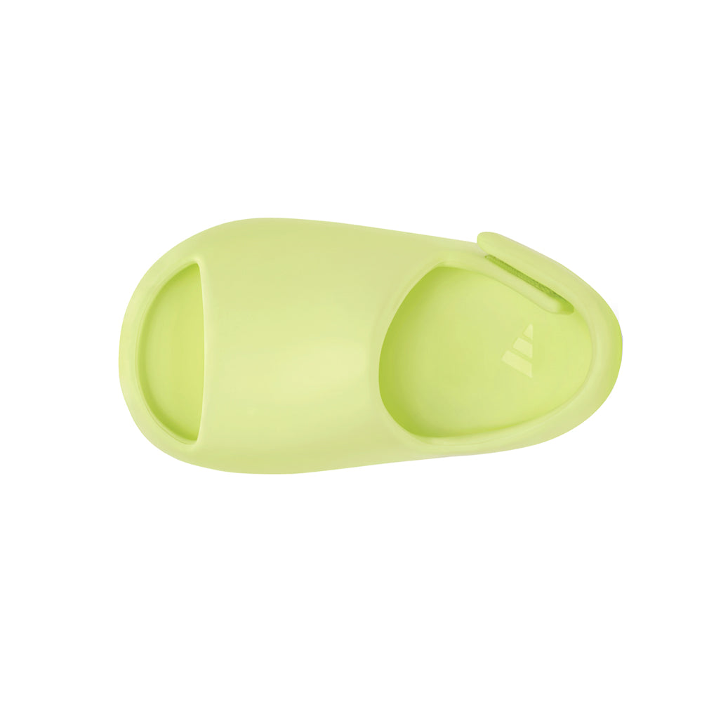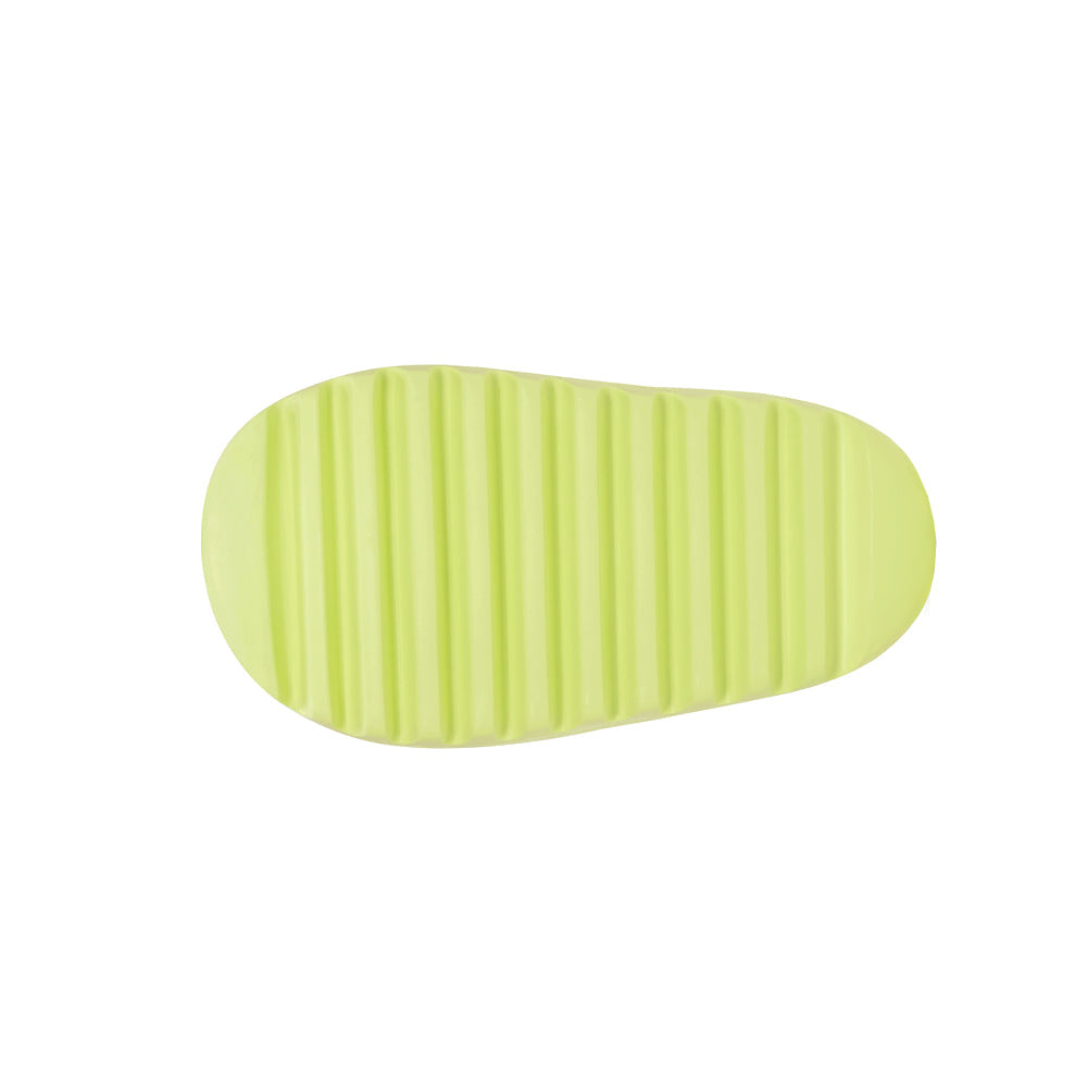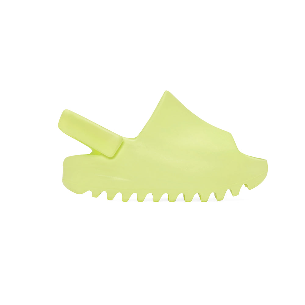 The adidas Yeezy Slides Infants ‘Glow Green’ pairs an eye-catching one-note finish with a minimalist design built for comfort. A vivid shade of green is applied to the slip-on, crafted from injected EVA foam and equipped with a heel strap for an extra-secure fit. Debossed at the base of the plush footbed, adidas’ Three Stripes logo represents the only bit of exterior branding. The sandal rides on a sawtooth outsole that delivers both grippy traction and impact protection.